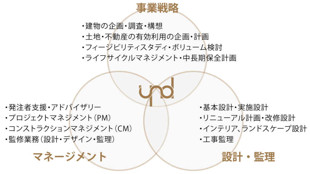 『建築デザイン』×『プロジェクトデザイン』×『事業戦略』の3つの観点から建物価値を最大化するソリューションを提供します。