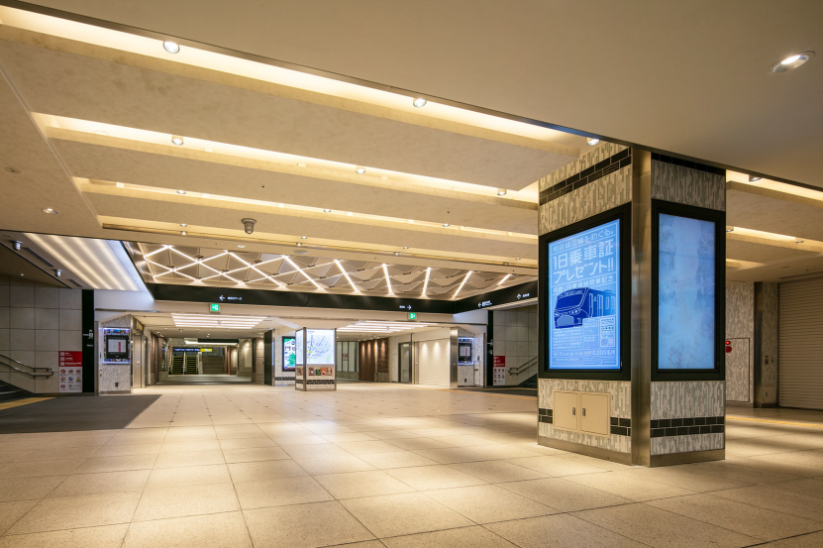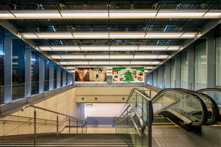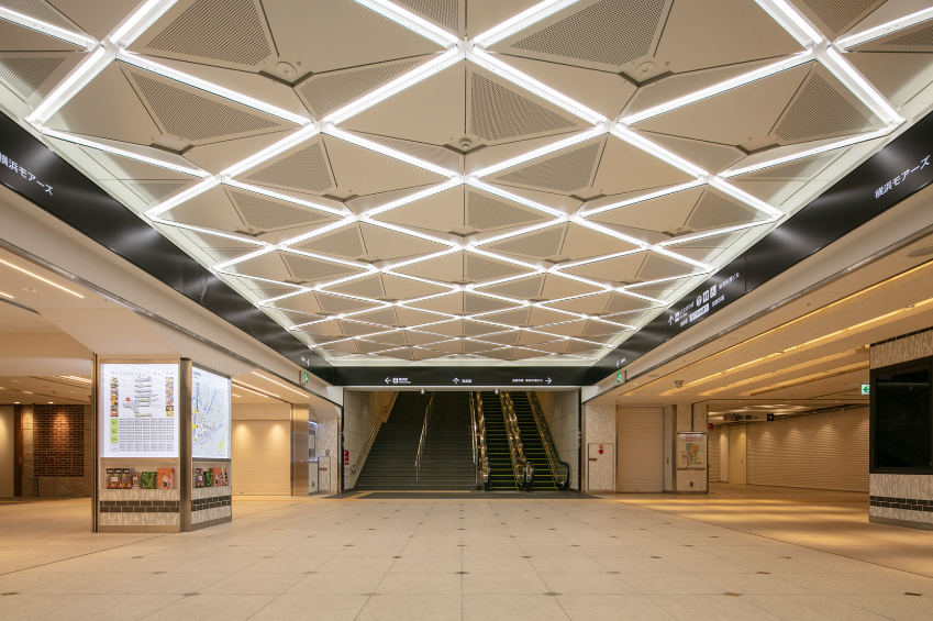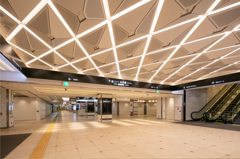地下部は西口地下街と駅ビル及び駅前広場とのメインの交通結節点に位置します。地下特有の天井の低さや意匠性を妨げる要素(柱・ハンチ梁・設備等)をデザインの中に取り込んだ上で光の連続を感じさせるアイコニックな形態とすることで、ランドマーク性の高い快適な空間を実現しました。